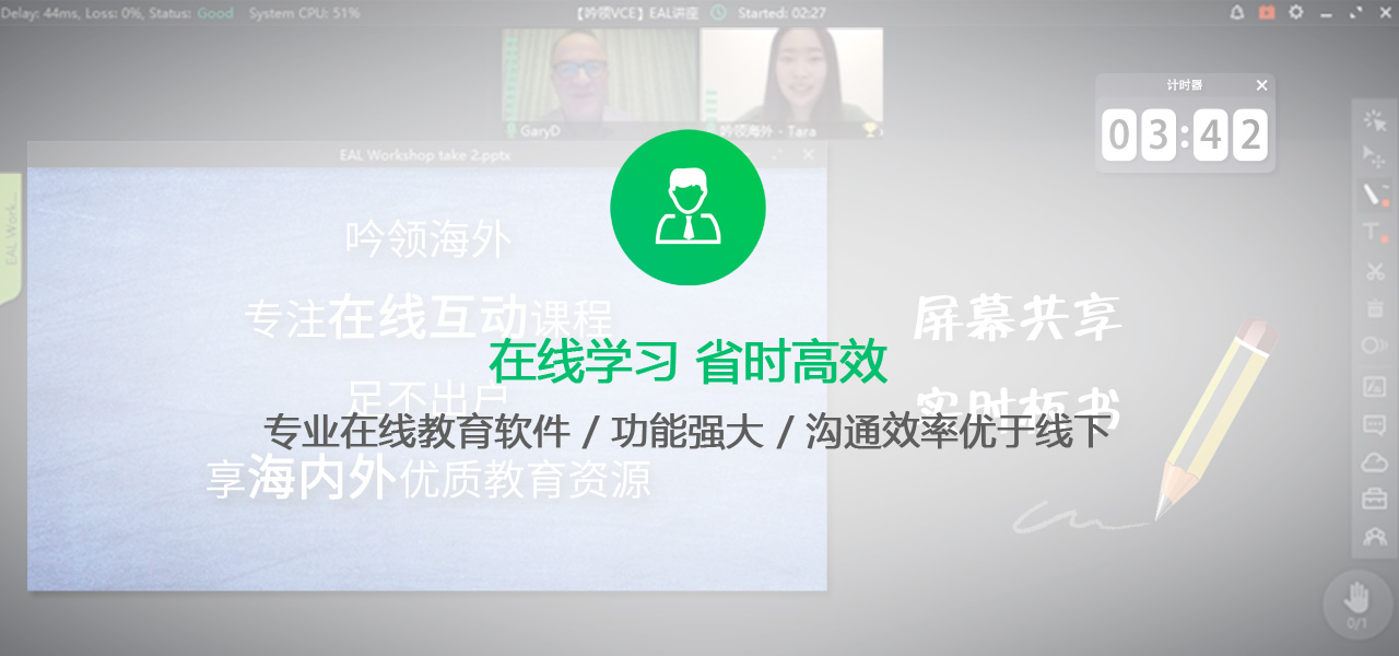 吟领海外在线课程,使用专业授课软件,为在线教育量身定制,而非普通会议软件; 除了可以看到老师PPT、实时板书、视频、语音, 还有抢答器、倒计时器、颁发奖杯、文档协同编辑器(师生可同时写作、编辑一个文档)等, 在线互动上课,在家就能学,节省通勤时间;课后保持在线练习,大大提高时间利用率。