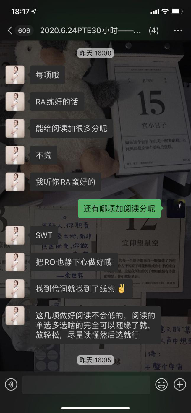 虽然要求分不高但是第一次接触PTE 看着陌生的题型还是很懵且担心的 但是Allyson老师超级有耐心 也一直鼓励我 让我对PTE没有那么地害怕了 抱着一次过和为自己梦校努力的决心我开始了学习,第一二天我每天都会练差不多两组RA 14~20个左右