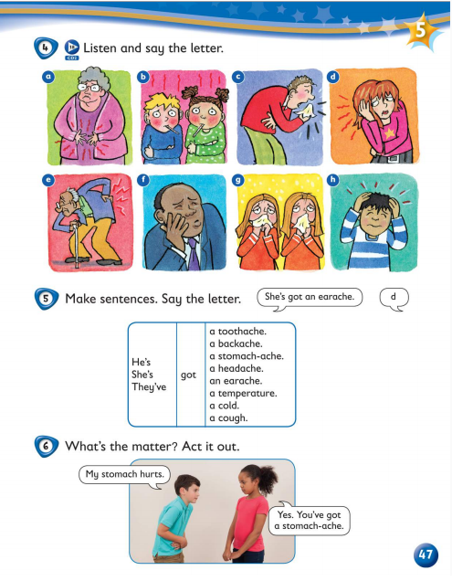 比如下图中的第4部分,听单词选图片,让孩子加深对单词发音的印象。第5部分中是根据框内的单词造句,再次巩固生病相关的表达。而第6部分是把图中的场景演示出来,不仅建立起语言知识和日常生活的联系,更增强了学习的互动性,也是一次成果展示的机会。