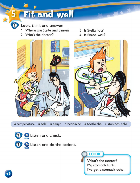 单元一开始就通过看医生的生活化场景,带学习者了解各种常见病状的表达,如感冒,咳嗽,头痛等,建立背景知识,让孩子对要学习的内容有一个初步的判断了解。