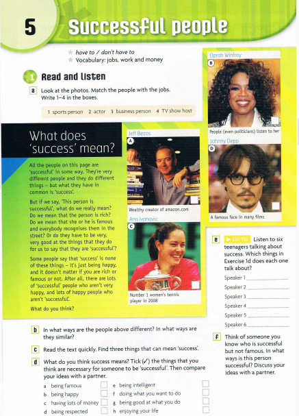开篇是阅读和听力,让学生通过阅读配对和听青少年的发言,对何为成功有一个初步的了解和思考。