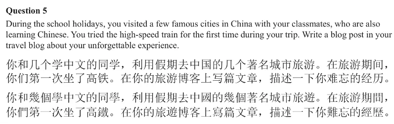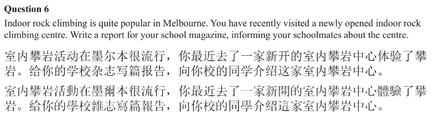相比于中国的高考,VCE中文大大增加了学生写作的灵活性。VCE中文第二语言高级 (Chinses Second Language Advanced) 写作部分的字数要求是300-350字,总分是20分。在考试时,学生需要从四个考题(Questions)中任选一个来写。四个考题代表了四种不同的写作类型,分别是:描述文、说明文、评估文和想象文。