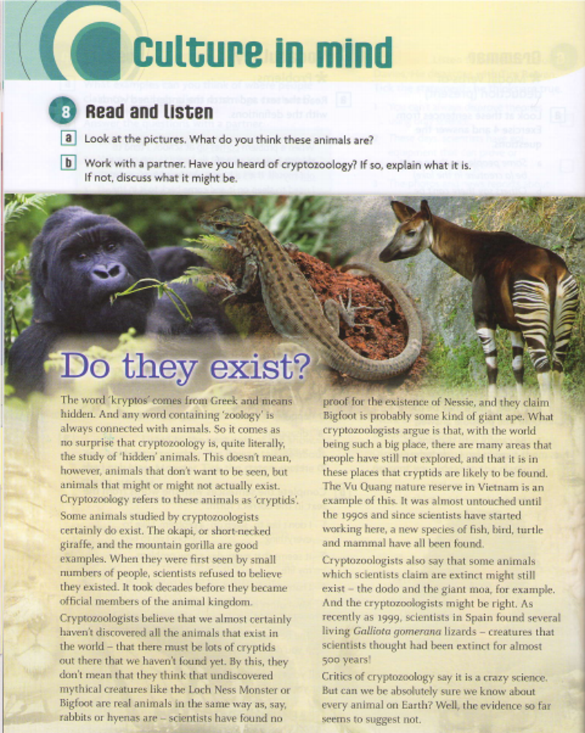 这一单元的主题是探索真相。Culture in Mind 的话题十分有趣,带领学生一起探索一些生物是否在历史上真实存在过。