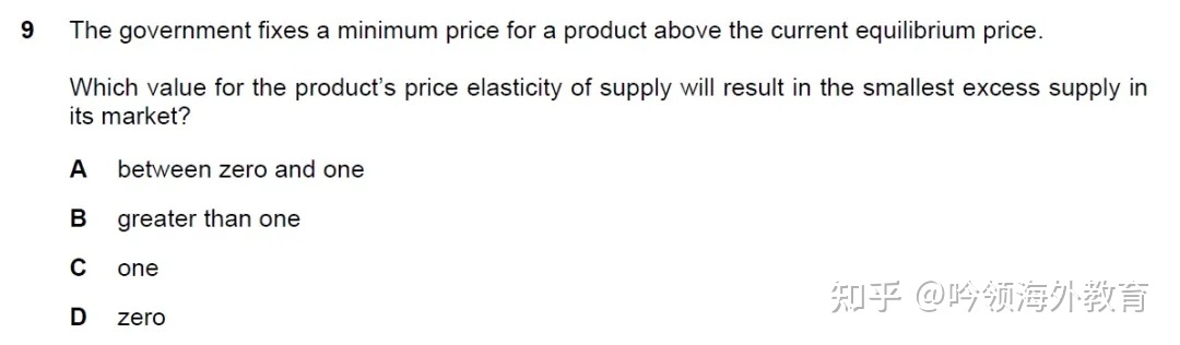 解析:这题很多同学会错误地选择了A(Inelastic Supply)。但是这题的重点在于Smallest Excess Supply,在最极端的情况下,也就是Zero Elasticity的时候(Supply完全无法改变时)Excess最小,因此 D 是正确的。