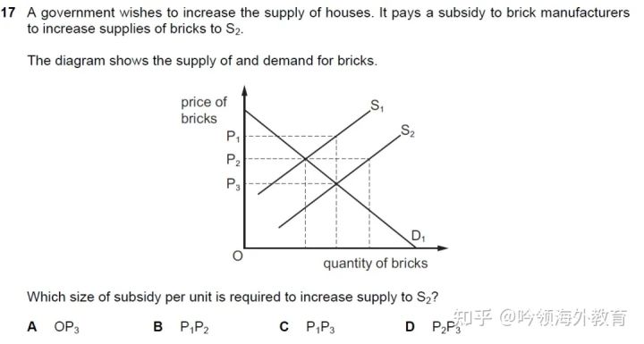 解析:正确答案 C 确定了Initial Supply Curve S1 和New Supply Curve S2 之间的垂直距离。很多同学误选 D ,仅代表价格的变化,而不等于Subsidy的总价值。