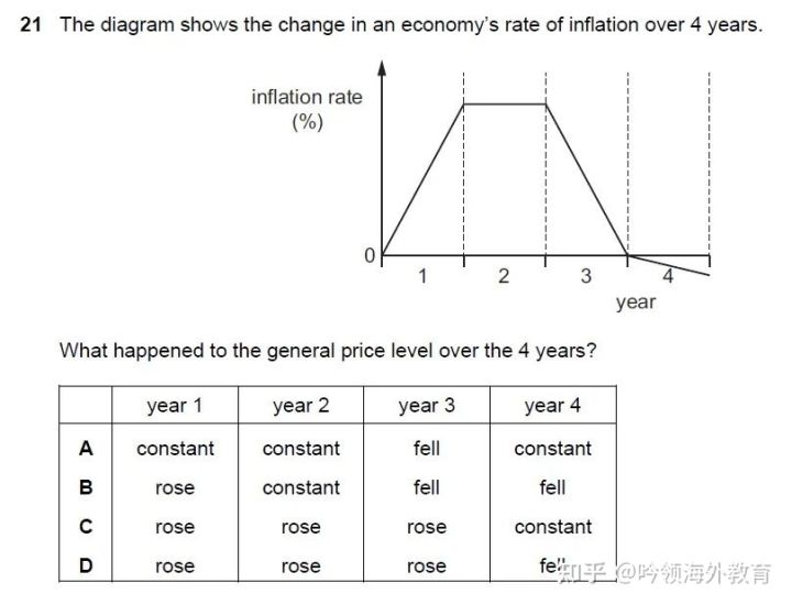 解析:很多同学会混淆Rate of Inflation(通货膨胀率)的和Price Level(价格水平)。只要Rate of Inflation为正,Price Level就会上升。只有当Inflation是负数时Price Level才会下降。如图只有第四年,Inflation是负数,Price Level下降,所以选D。