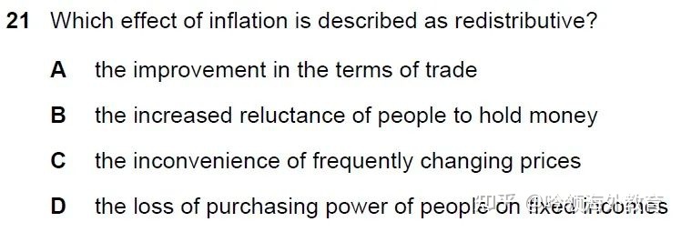 解析:这题关键理解Redistribution 是和Income/Wealth (收入和财富)有关。对“Fixed Income”的人来说,Inflation导致不变的收入只能买到更少的东西,等于购买力降低。