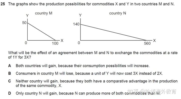 解析:经过计算,我们会发现M国X和Y生产比例是1Y for 2X, N国X和Y生产比例是1Y for 4X, 而题目中1Y for 3X的交换比例正好在两国之间。M国的消费者将受益于生产Y 的Comparative Advantage,并且有获得更多的商品 X。相反,N国的消费者将受益于生产X 的Comparative Advantage,并且有获得更多的商品 Y。所以两国同时收益。