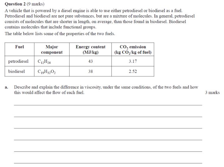 主要在于比较fossil fuel 与biofuel。一个重点是通过intermolecular forces 比较physical properties (viscosity, cloud point, hygroscopic property) ofbiodiesel and petroldiesel ,由此也可以分析其应用,例如低温下应使用petroldiesel而非biodiesel。另一个重点是讨论environmental impact of fuels。