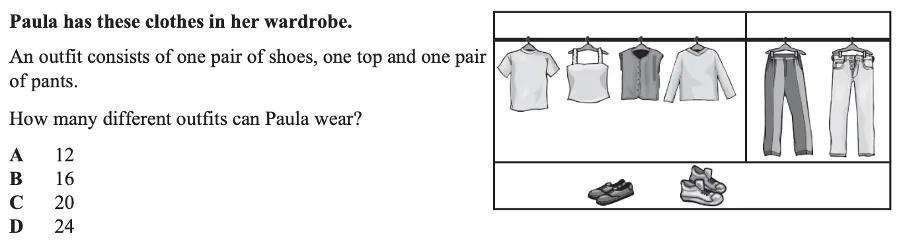 本题选自7年级考试的数字推理部分。这道题目是关于组合数学的基础问题。题目给出了Paula衣柜里的衣物,并要求计算她可以搭配出多少种不同的服装组合。