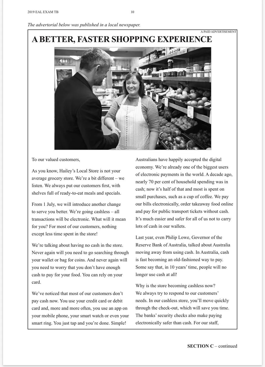 The writer commences by introducing her store.(Topic sentence) The title suggests her shop will provide customers with ‘better, faster shopping experiences’,(题目积极意向分析) implying the change she will be adopting is a positive change which favors customers shopping experience. She also addresses ‘valued customers’ and commend her store as ‘not average grocery store’ and ‘always put our customers first’ with inclusive language (Technique & Evidence) in attempting to build a friendly rapport with the local customers by presenting herself as a manager who truly cares about all customer’s opinions. Audiences are positioned to (读者感受)be grateful of Astaire’s suggestion as the store is customer centered for their needs. To advance the argument, the photo is a medium shot of both the customer and the staff, highlighting their both delighted facial expression (图片描述). This illustrates how both parties are satisfying with the decision of going cashless(点contention )evoking audience’s (读者感受) urge to experience the convenient way of paying. The photo also presents the characters shaking hands, implying their mutual agreement of going cashless and suggestion the store’s decision is not only for self benefit, but also has considered customers’ welfare(图片意图分析). This positions readers (读者感受again~)to feel a sense of inclusion as they can see their opinion is valuable to the store.