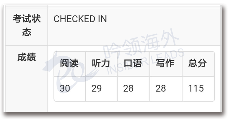 总分:115 (阅读30 听力29 口语28 写作28)