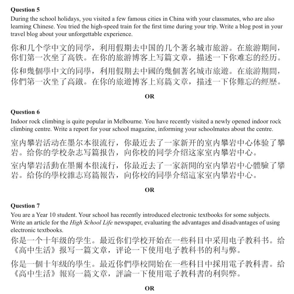 与国内的选项单一的高考题不同,澳洲的VCE中文作文会提供给学生4- 5个题目供考生选择,文体更丰富,包括议论文、记叙文、想象文等等,这样使得孩子们能够挑选自己最有话说、最有把握的题目,还是非常人性化的!