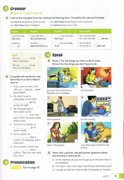 在讲解语法知识后,EIM教材给学生提供练习语法知识的机会,比如下图的填空练习和看图说话。题型多样,让学生巩固语法知识,加强对已学用法的理解。