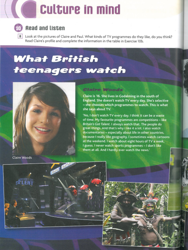 这一单元的主题是看电视,因此Culture in Mind也围绕这一主题,带领孩子们了解英国的青少年看电视的习惯,比如平时看哪些电视节目,通过阅读和听力,让学生进一步了解同龄英国学生的业余生活。