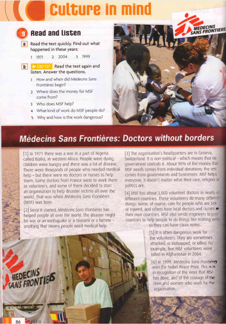本单元的主题是看医生。Culture in Mind就讲述了一个由志愿医生组成的机构如何救助不同国家的伤病员的故事。让学生了解国际组织的重要性和医生的奉献精神。
