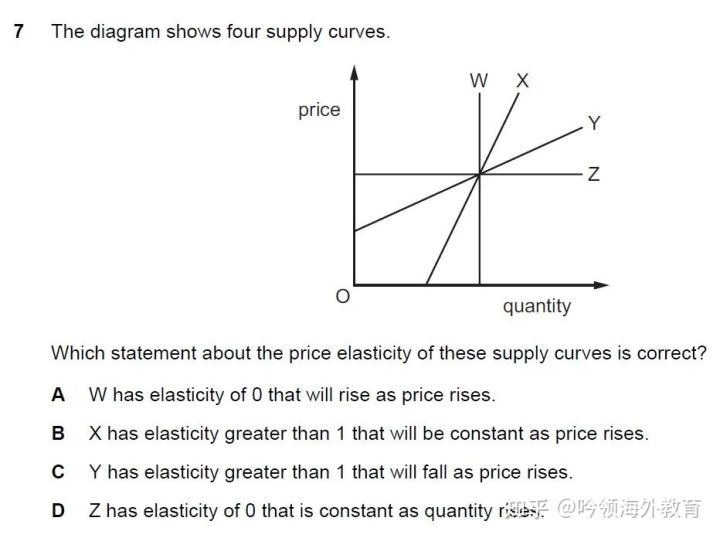 解析:这题需要理解PES与Supply Curve斜率之间的关系。Z是Perfectly Elastic, W是Perfectly Inelastic。Supply Curve Y与原点上方的Vertical Axis相交。这表明供给弹性的价格一开始会大于 1,然后随着价格的上升和沿着supply curve向上运动而下降。所以选C。