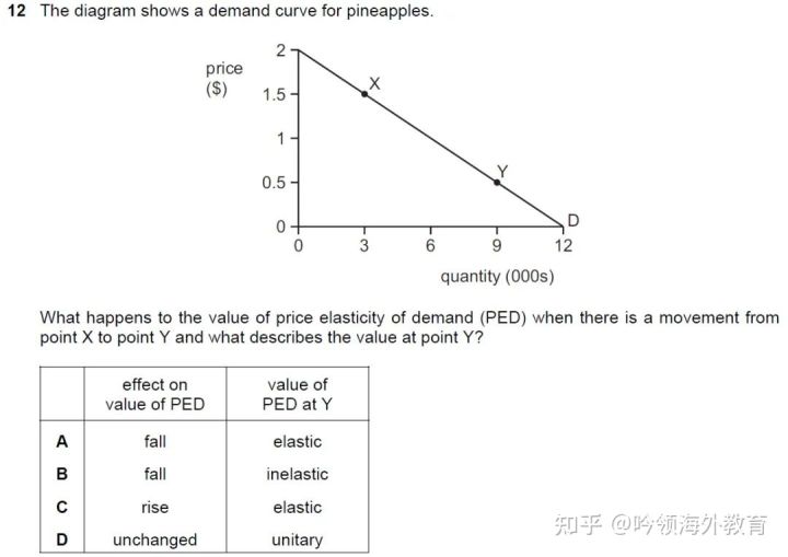 解析:这题很多同学会选错成D ,但是要记住只有在Unit Elasticity 的时候D才成立哦。要记住在这种Demand Curve情况下,Price Elasticity of Demand会在点沿着Demand Curve向下移动而下降。