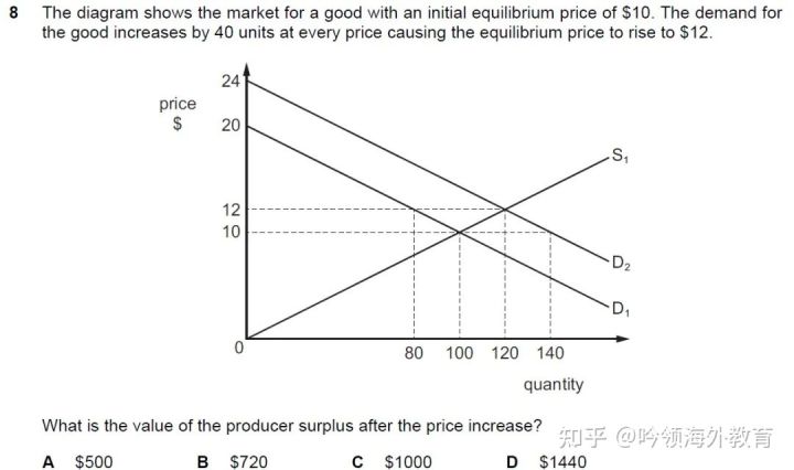 解析:这题很多同学会混淆producer surplus和producer revenue。选项是需求增加后的Producer Revenue。Producer Surplus是水平价格线和Supply Curve所覆盖的面积,在这种情况下面积 = ($12 × 120)/2 = $720, 因此选B.