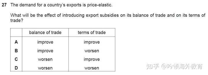 解析:很多同学会将Balance of Trade与Terms of Trade混淆。Balance of Trade是Export 与Import的差值;Terms of Trade是Export 与Import价格的比例(the Price of Exports in Relation to the Price of Import)。Export Subsidy 会增加Export,Improve Balance of Trade, 但是Export Price会降低,所以Worsen Terms of Trade。