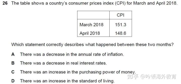 解析:这题的关键在于理解CPI和Inflation之间的关系。CPI是衡量通货膨胀(Inflation)最知名的指标,CPI衡量一定时期内城乡居民所购买的生活消费品和服务项目价格变动趋势和程度的相对数。题中清楚地表明CPI下降,也就是Inflation下降,反过来Purchasing Power of Money(货币购买力)增加。