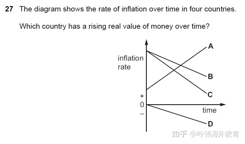 解析:解释图中表示的Inflation, Disinflation and Deflation。与例题1一样,只有Inflation随着时间的推移为负时,货币的实际价值会上升 ,即在Deflation。所以选D