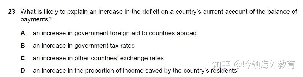 解析:Current Account of the Balance of Payments由四部分组成:Trade in Goods ,Trade in Services ,Income Flows ,Current Transfers。Foreign Aid属于Current Transfer,会增加Deficit。很多同学会误选C,其他国家汇率的上升相当于本国外汇汇率的下降,预计会减少而不是增加赤字。