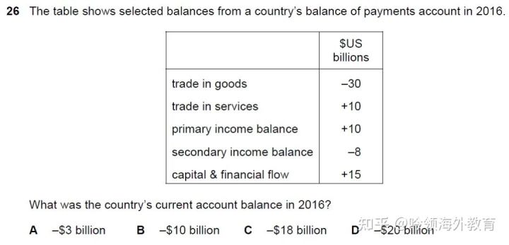 解析:Capital &Financial Flow 不属于Current Account of Balance of Payments, 所以Current Account Balance = -30+10+10-8=-$18 billion,选C