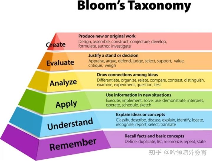 在Bloom’s Taxonomy(布鲁姆分类学)中,学习被分成了6个不同阶段:Remember(记忆),Understand(理解),Apply(运用),Analyze(分析),Evaluate(评估)和Create(创造)。