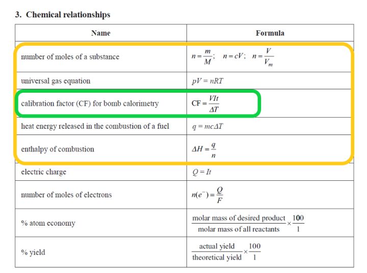 从data booklet可以看到,VCE化学考试中考察的计算主要包括Stoichiometry, gas equation,energy/enthalpy,Faraday‘s law 和 yield. 其中加粗的三项(即黄框中的内容)都属于Unit 3 AOS 1。(绿框中的CF公式是q=mcΔT在bomb calorimetry中的延伸,在Heinemann Chemistry Chapter 17。一些学校会选择与AOS 1一起考察,也有一些会选择留到Y12最后。)