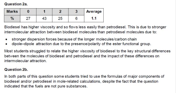 主要在于比较fossil fuel 与biofuel。一个重点是通过intermolecular forces 比较physical properties (viscosity, cloud point, hygroscopic property) ofbiodiesel and petroldiesel ,由此也可以分析其应用,例如低温下应使用petroldiesel而非biodiesel。另一个重点是讨论environmental impact of fuels。