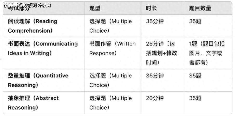 阅读理解、书面表达、数量推理和抽象推理,其中三项为选择题,一项需书面作答,且具有严格的时间限制。考试不仅考察学生的学术能力,还要求具备高效的答题策略,例如如何快速作答和组织写作结构。