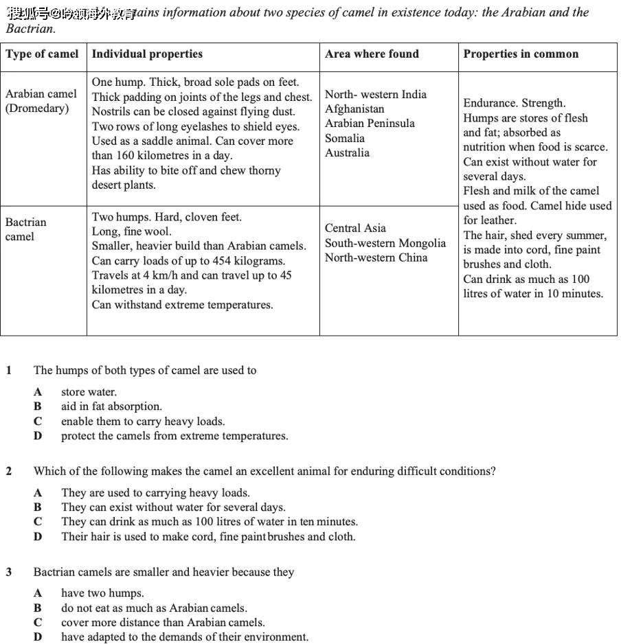 本题选自7年级考试的阅读理解题,评估学生理解和解释一系列文本的能力,其中可能包括小说、非小说、诗歌和戏剧,以及图表、表格、图表或地图。材料可能会来 来自一系列学科领域,但不需要超出文本信息的这些领域的专业知识。例如,这道题目涉及两种骆驼:阿拉伯骆驼(单峰骆驼)和双峰骆驼(Bactrian camel)。题目提供了关于这两种骆驼的特性、分布区域以及它们的共同特点的表格,并提问关于驼峰的功能、优点、区别等问题。