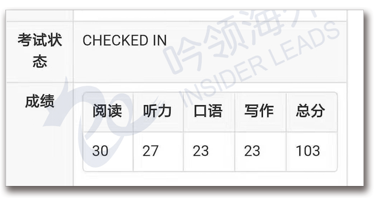 总分:103 (阅读30 听力27 口语23 写作23)